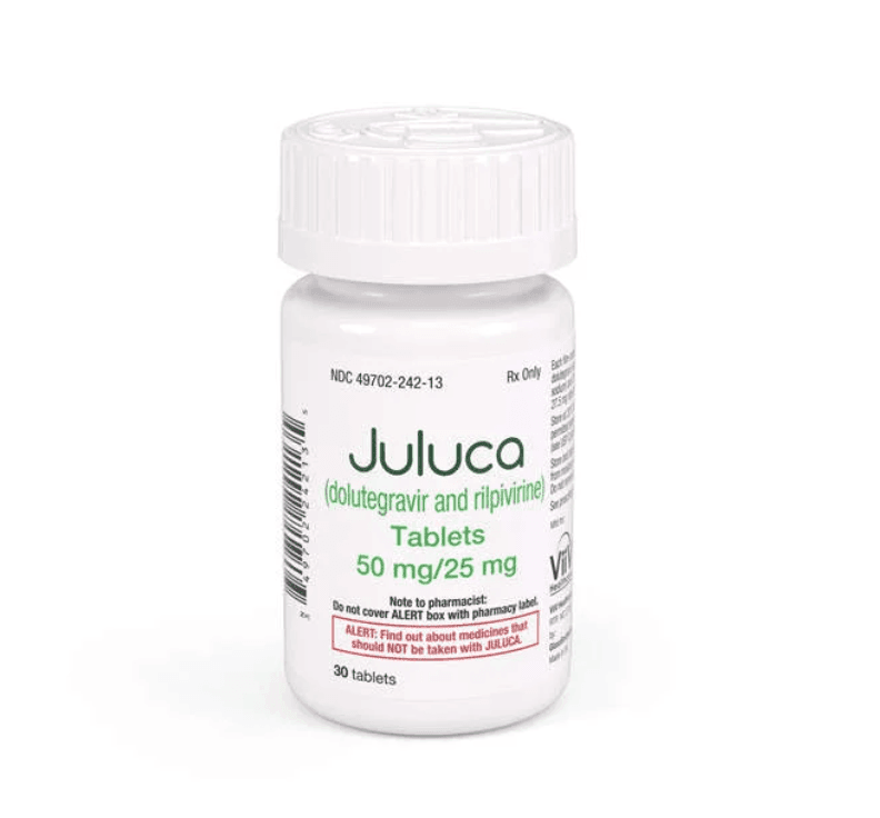 Juluca® combines dolutegravir, an integrase inhibitor, and rilpivirine, a non-nucleoside reverse transcriptase inhibitor. Together, they block HIV replication at two different steps. It is used as a replacement regimen for people whose HIV-1 is already virologically suppressed on a stable therapy, with no history of treatment failure and no known or suspected resistance to either component.